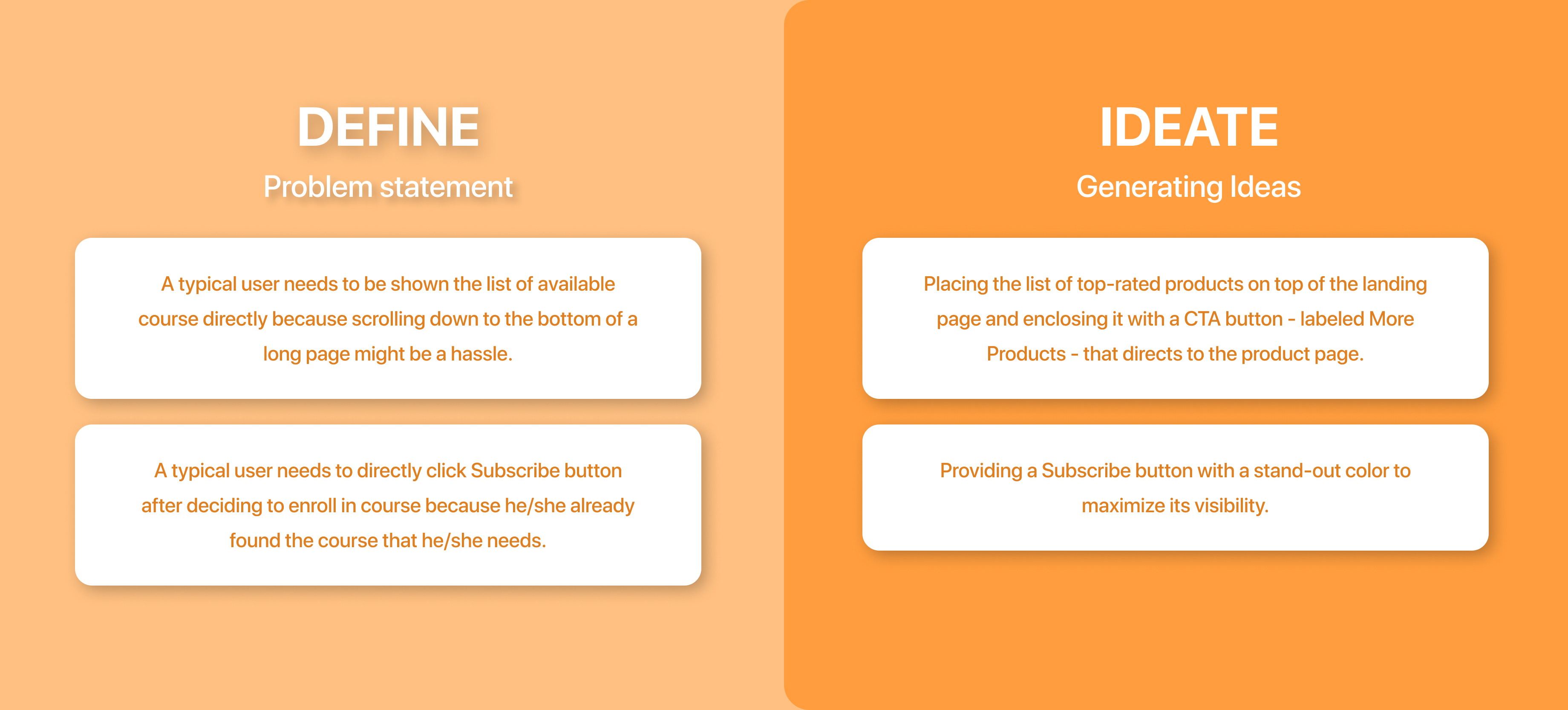 Of course, we intended to have more distinct wireframe testing and hi-fi prototype testing at the conclusion of the project. I started with the Design Thinking Framework and tweaked it a bit. In the end, I separated my design approach into four primary parts.